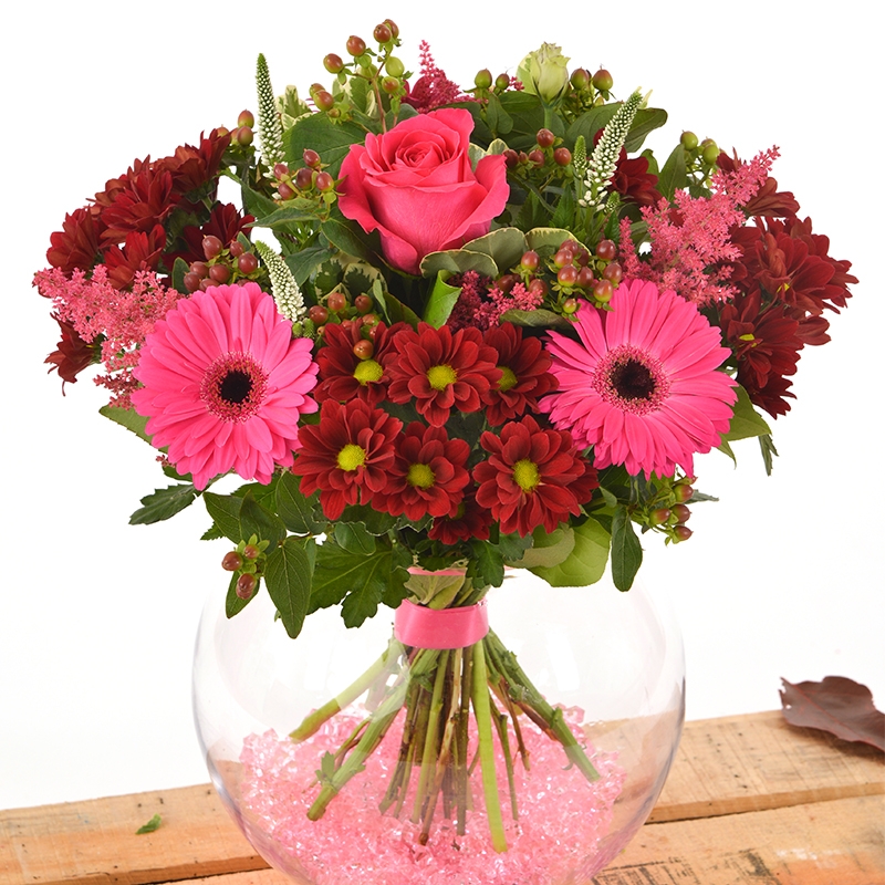 A vibrant mixture of pink and red tones in this elegant handtied bouquet. Complete with vase (vase may vary in shape and colour)