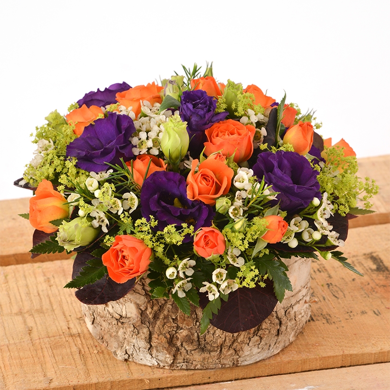 Reflecting the trend for natural material this bark log looks beautiful with a posy of burnt orange and vivid purple flowers complete on log slice.