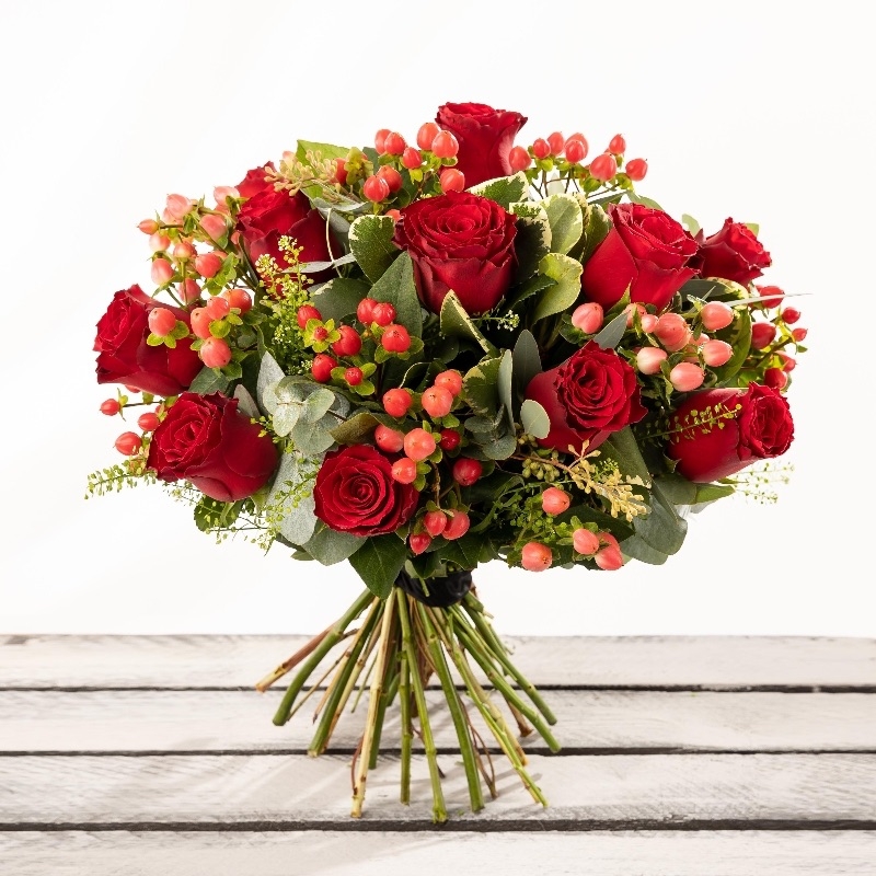 What's your Christmas Wish this year? This exquisite bouquet is the opulent floral gift to send. Designed by our expert florists, we use luxurious red roses, hypericum berries, and seasonal greenery such as eucalyptus to create a beautiful hand-tied. A dramatic statement to tell someone 'I Love You' this Christmas.