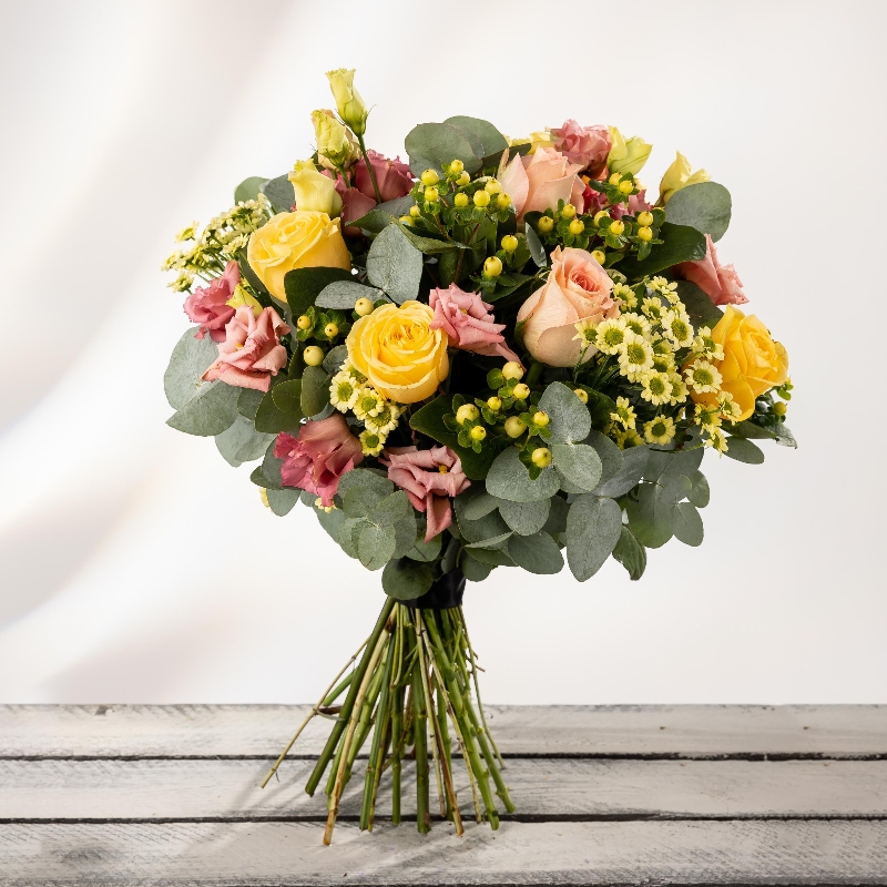 A pretty floral bouquet, the Sweet Delight bouquet makes a gorgeous gift for a special occasion. We use sunshine yellow roses, pink lisianthus,  chrysanthemums, and silvery eucalyptus foliage to create a beautiful hand-tied bouquet.
